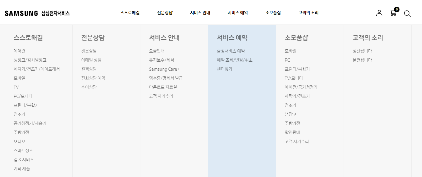 삼성전자서비스 홈페이지 ➡️ 전문상담 ➡️ 서비스 예약 ➡️ 출장 서비스 예약
