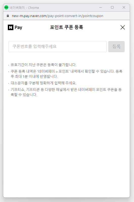 여기까지 오면 포인트 쿠폰 등록 창이 뜬다. 선물받은 기프티콘(비즈콘) 상품권 번호를 입력하면 자동으로 충전 완료!