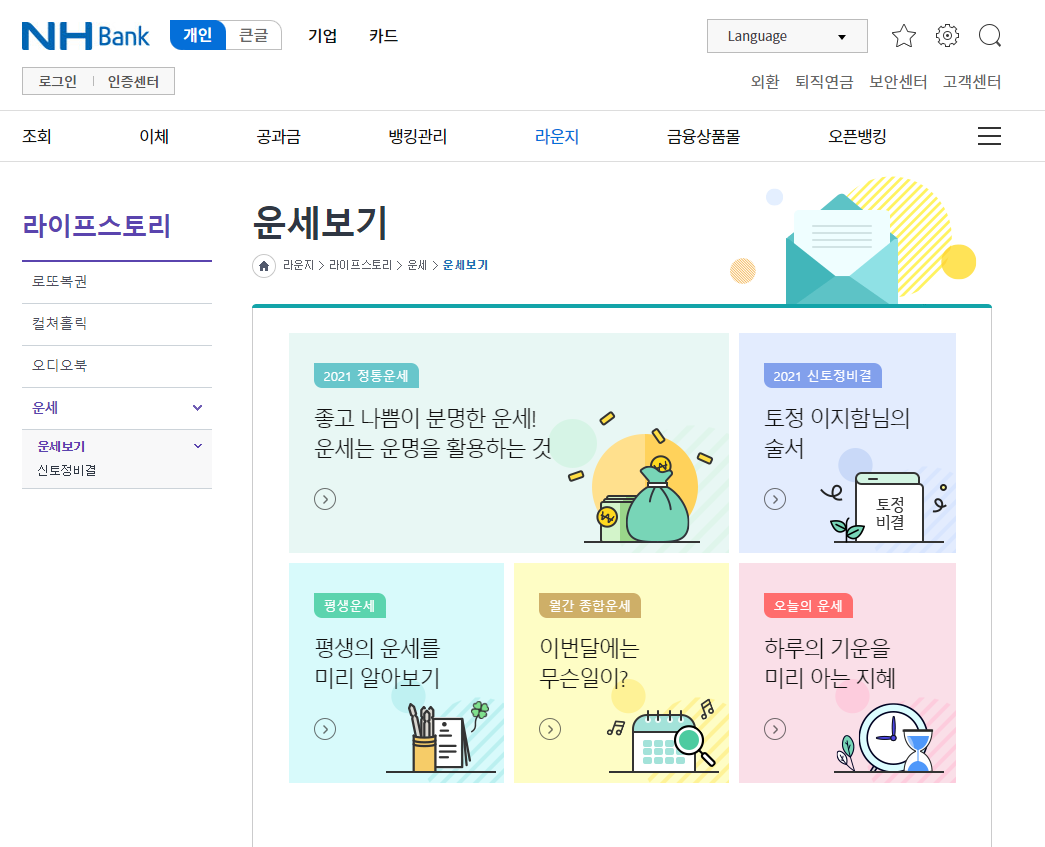 정통운세 / 생활운세 / 재물 운세 / 애정 궁합 / 퓨전 운세 / 기타 로 분류해 다양한 운세보기 기능을 제공하고 있다. 결과지 내용이 신한생명과 좀 겹치는 느낌이 있지만 농협도 자세한 풀이를 제공해줘서 추천!