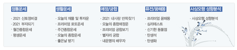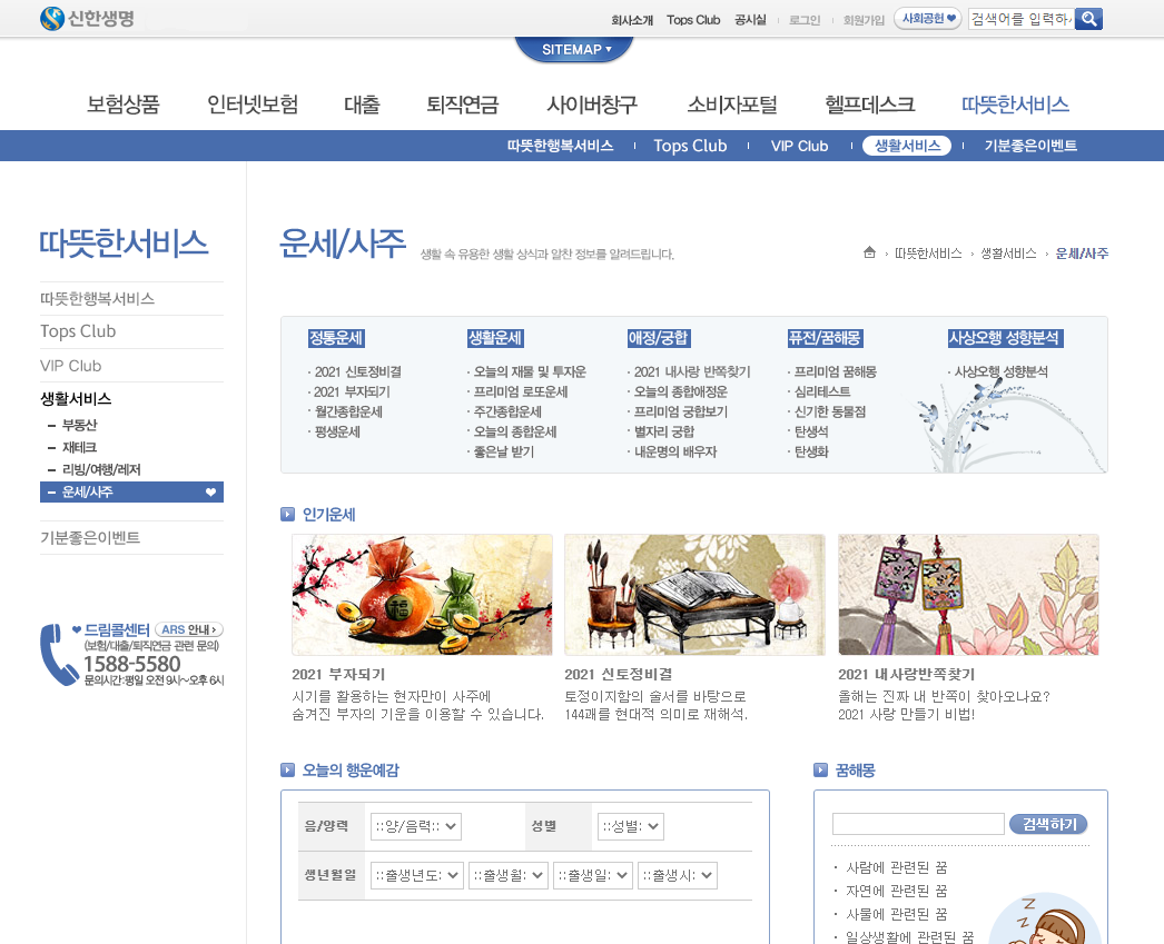 정통운세 / 생활운세 / 애정 궁합 / 퓨전 꿈해몽 / 사상 오행 성향분석 기능을 제공하고, 제법 길고 자세하게 풀이해줘서 매년 애용하는 사이트이다. 신한생명에서 이런 기능을 제공하고 있다는 사실을 알고 있는 분들도 은근히 많다고..!