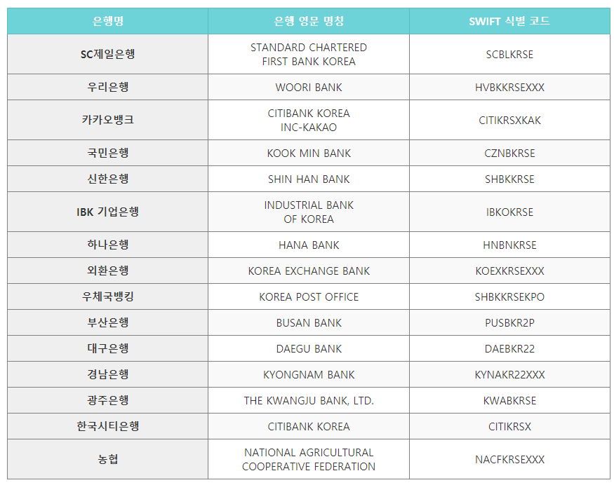 은행명 | 은행 영문 명칭 | SWIFT 식별 코드 |