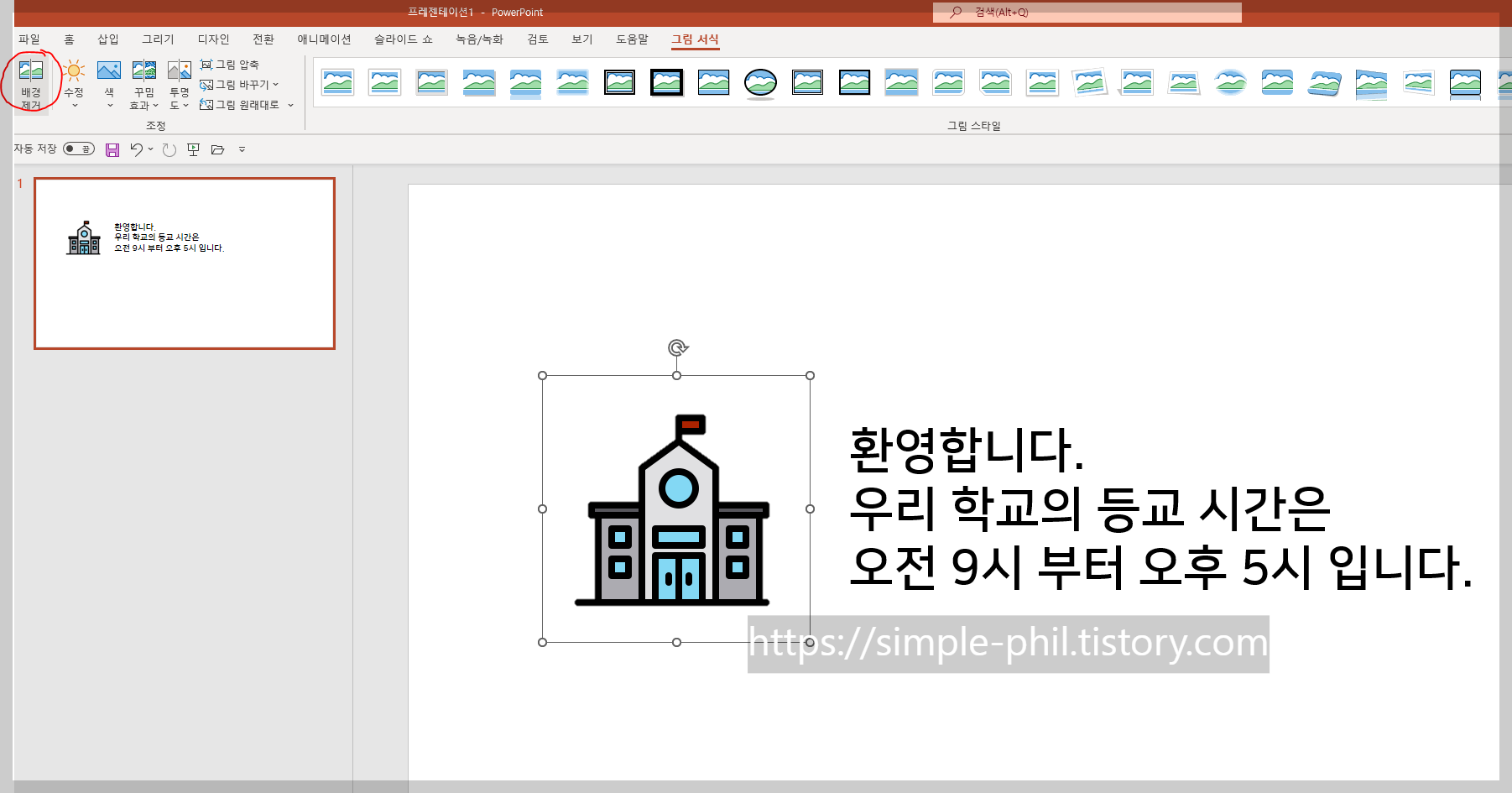 2. 이미지 클릭 후 [그림 서식 - 배경 제거] 선택