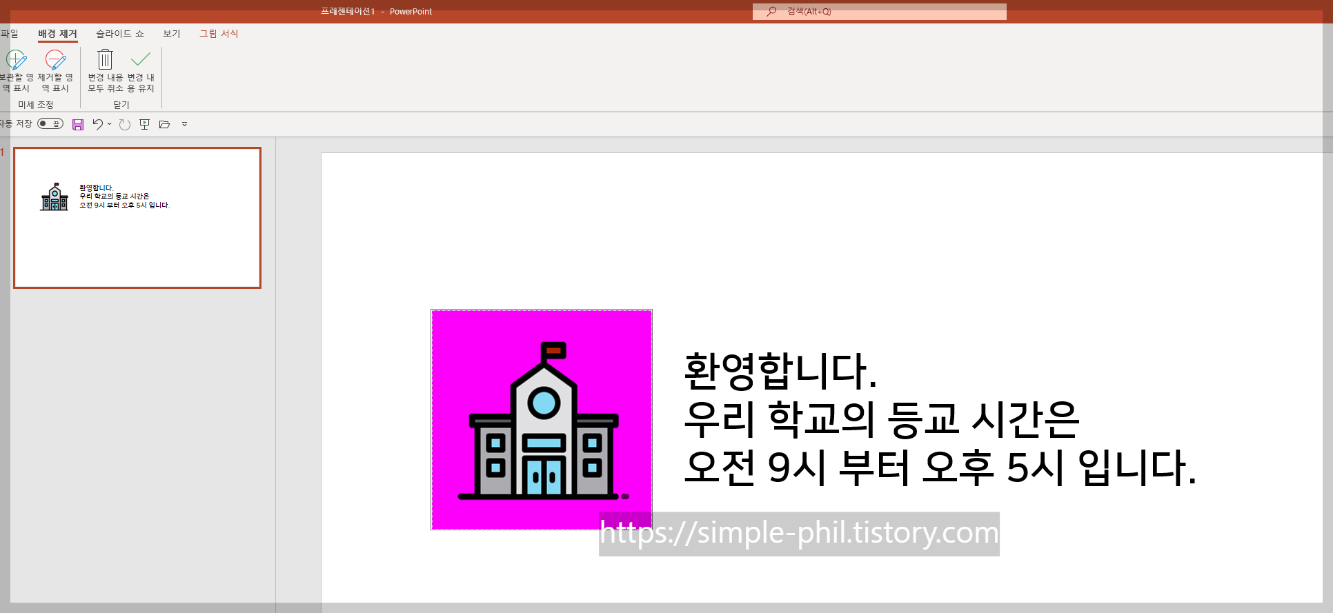 별도로 누끼를 따주는 사이트도 있고(추후 포스팅으로 기록하겠음), 포토샵을 잘 다루는 사람은 포토샵으로도 가능하지만, 간단한 이미지의 경우 PPT에서 지원하는 기본 기능만으로도 배경을 깔끔하게 지울 수 있다.