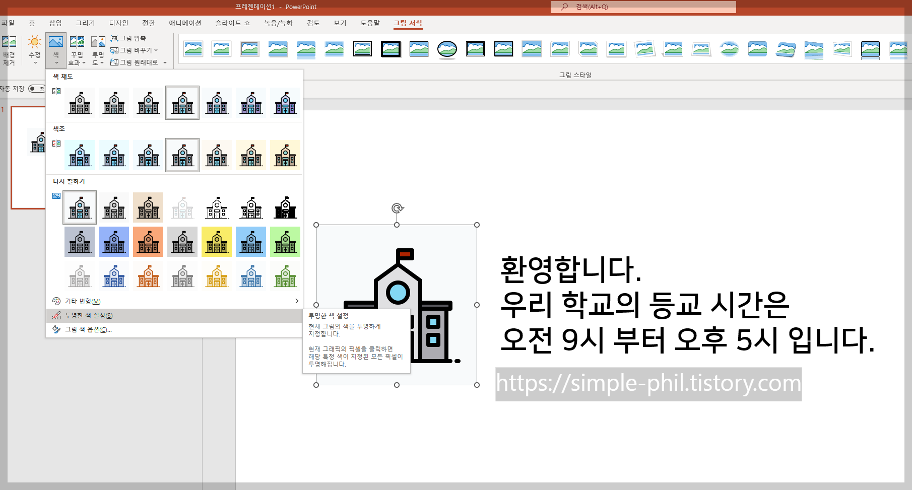 2. 이미지 클릭 후 [그림 서식 - 색 - 투명한 색 설정] 선택하고 지우고 싶은 컬러 클릭